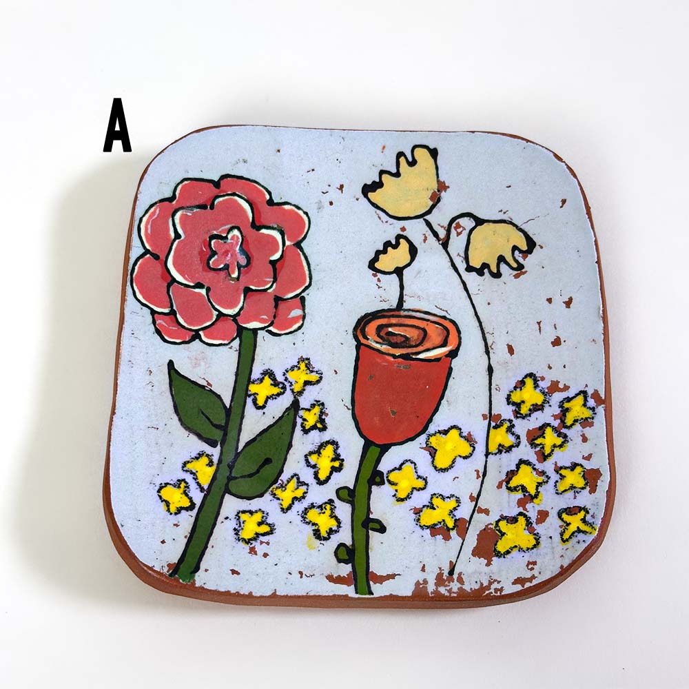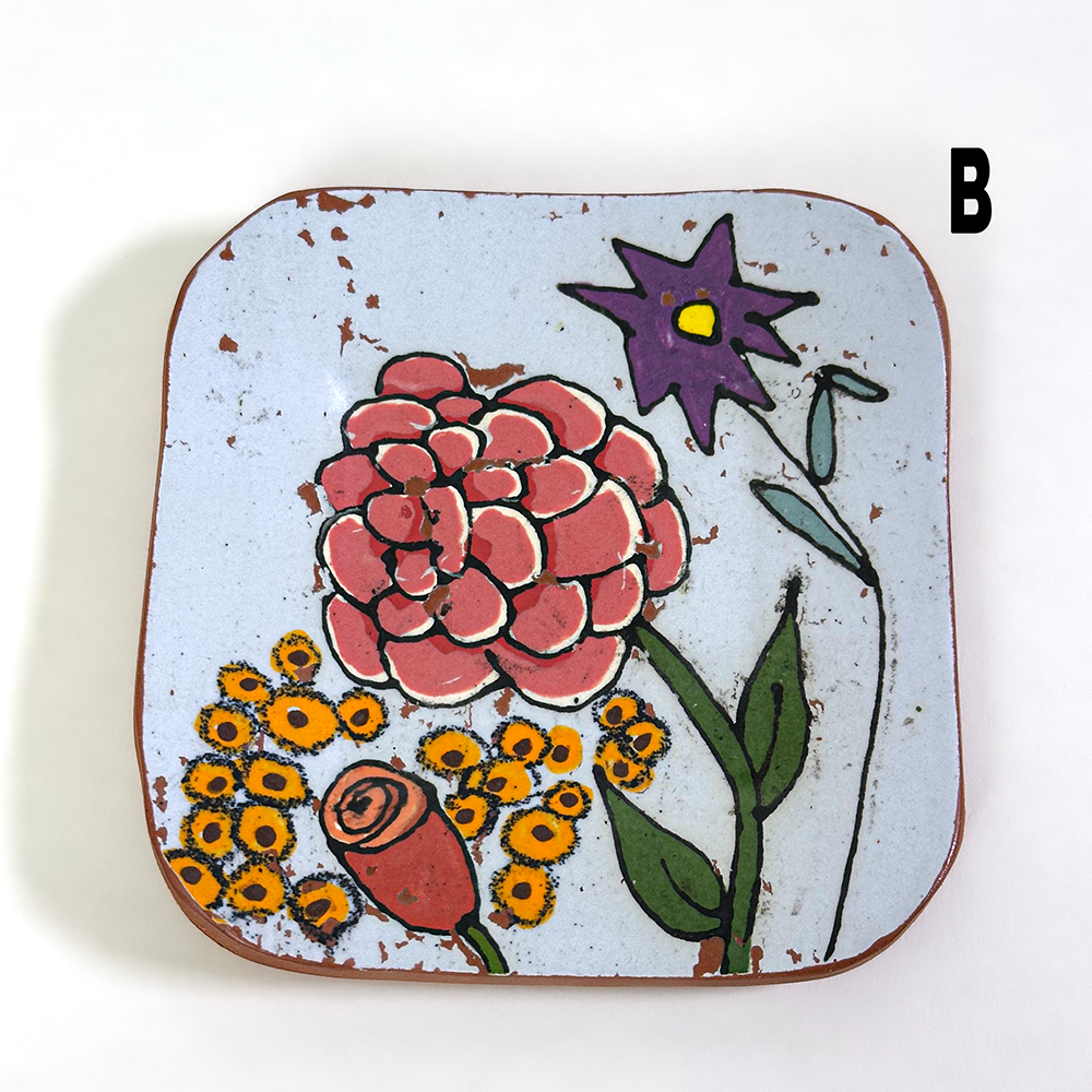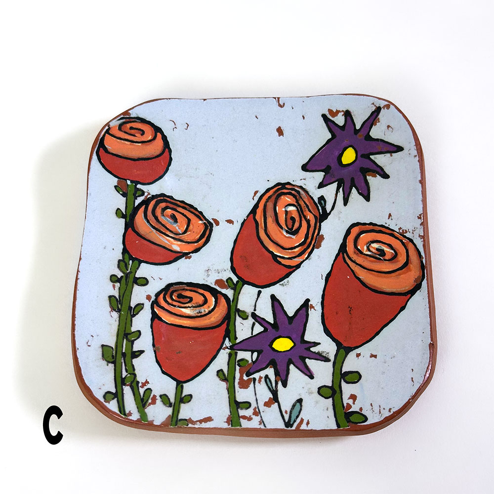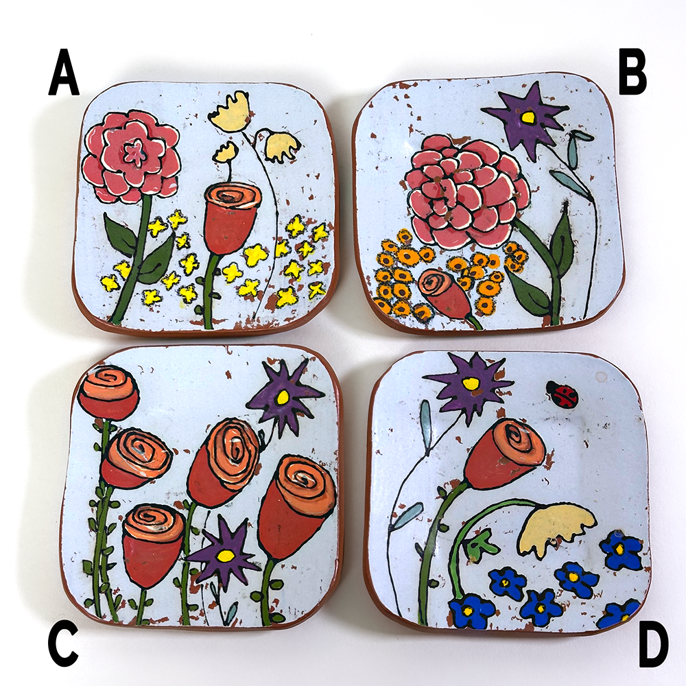 Hand-built from low-fire red clay, each dish is etched and painted with underglazes using a monoprint technique. Crafted in small batches, every piece is unique and one-of-a-kind.
